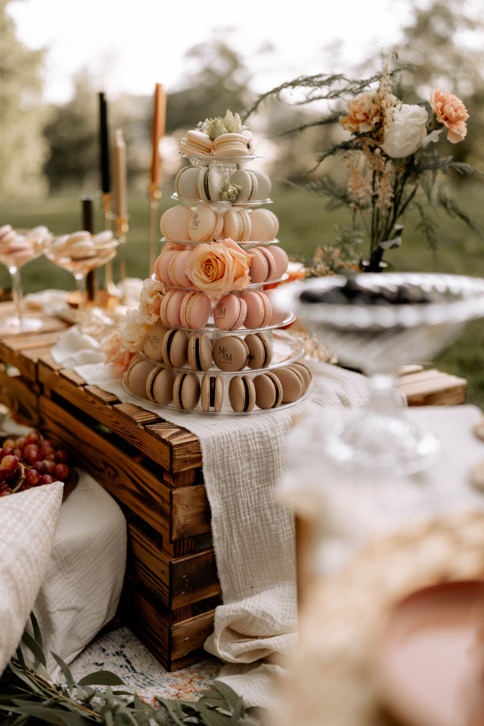 Create a focal point. Choose one hero element for your table. That might be a tall macaron tower, a croquembouche, or an oversized floral arrangement that anchors the display. Everything else should complement it, not compete.