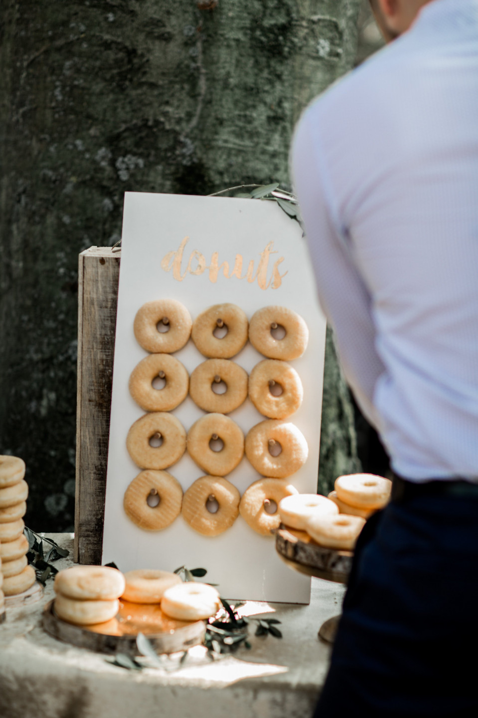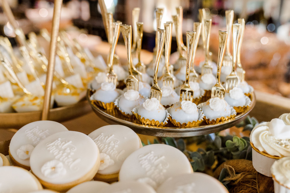 Match your color palette. Coordinate dessert colors with your wedding palette. Macarons in sage and blush, cupcakes with gold-leaf accents, or donuts glazed in your signature wedding color make the dessert feel intentional and on-brand.