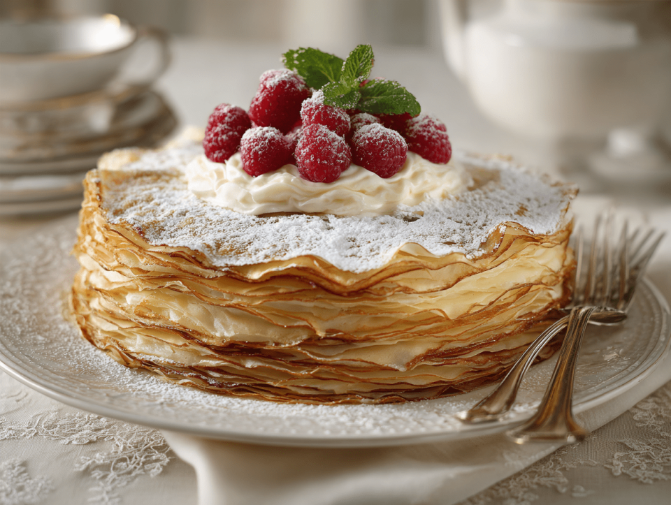 Pro tip: Top with fresh berries or edible flowers for a pop of color against the neutral crepe layers.