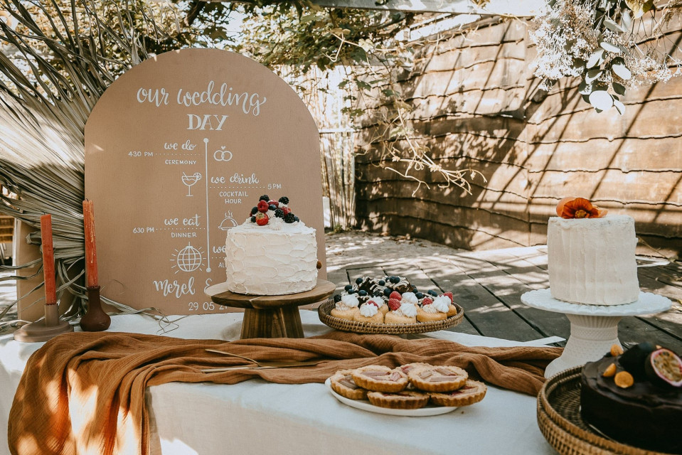 Can't decide? You don't have to. One of the most popular approaches is to have a small one- or two-tier cutting cake for the ceremonial cake-cutting moment, and then serve guests from a completely different dessert setup. This lets you honor the tradition without spending your entire dessert budget on a large tiered cake.