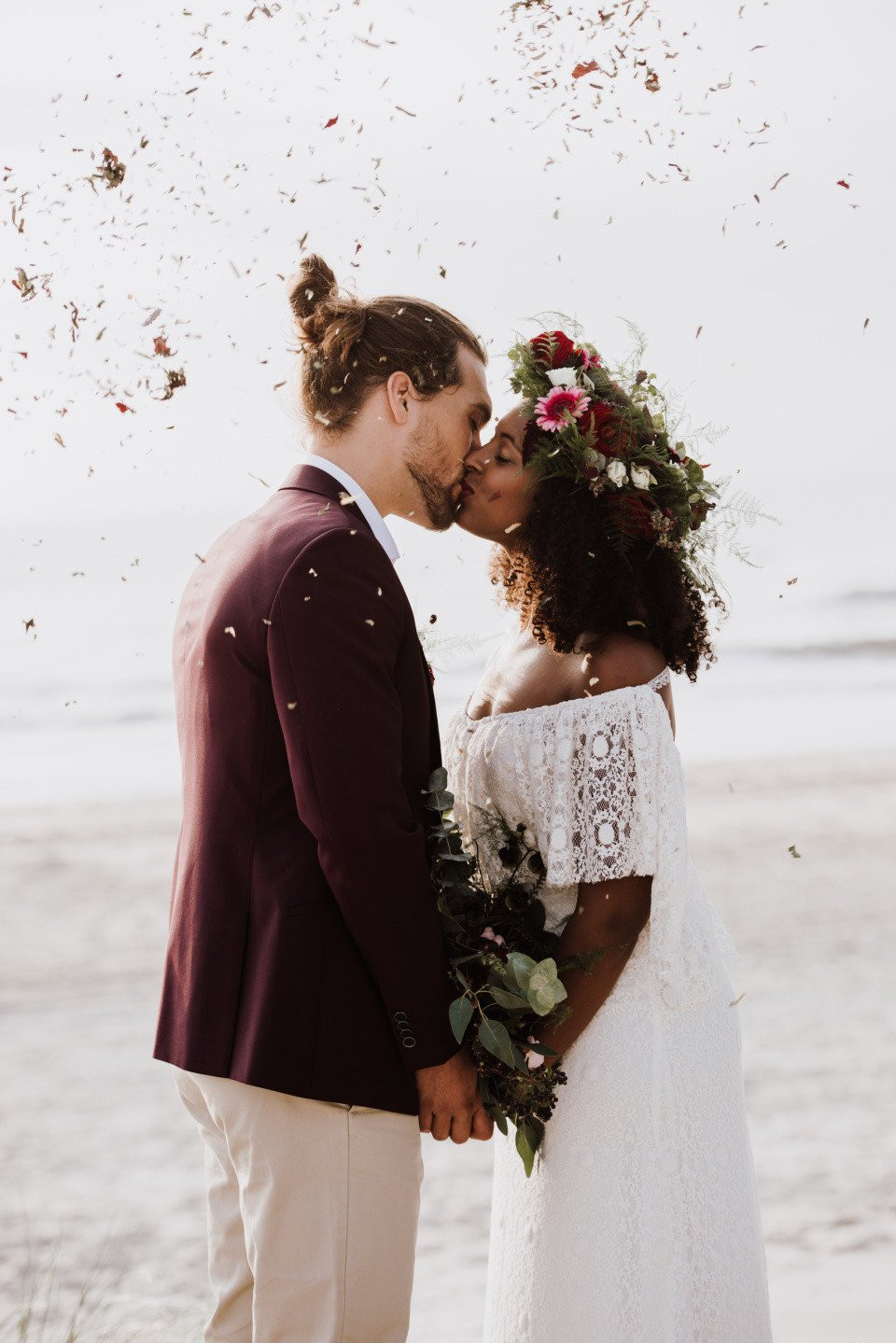 Attire: Flowy, bell-sleeved dress with lace for the bride. A floral crown or headband. Linen or corduroy suit for the groom in earth tones.