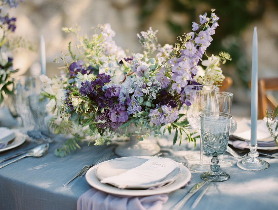 Dreamy and ethereal. This cool-toned palette suits outdoor ceremonies and modern, minimalist decor. Pair with: sweet peas, delphinium, and dusty miller.
