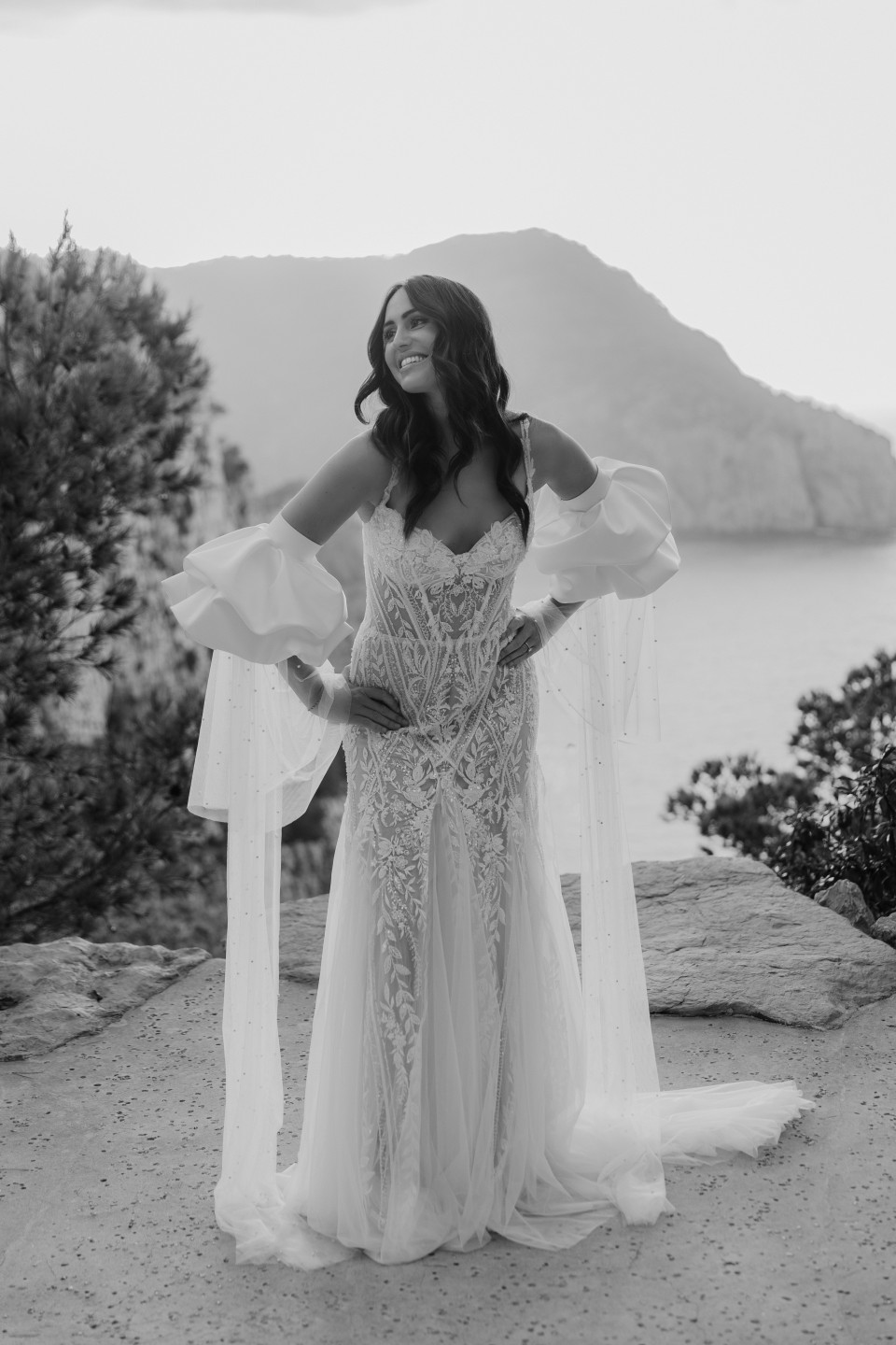 Detailed dress = simple veil. If your gown is heavily beaded, lace-covered, or architecturally complex, choose a plain tulle veil that does not compete. Let the dress be the star.