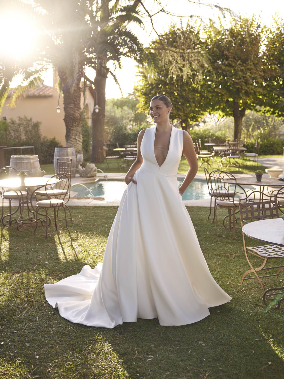 Mermaid (with stretch fabric). Curvy brides look incredible in mermaid dresses, especially in stretch fabrics (crepe, jersey) that move with the body rather than restricting it. The key is a mermaid that fits properly, not one that is too tight.