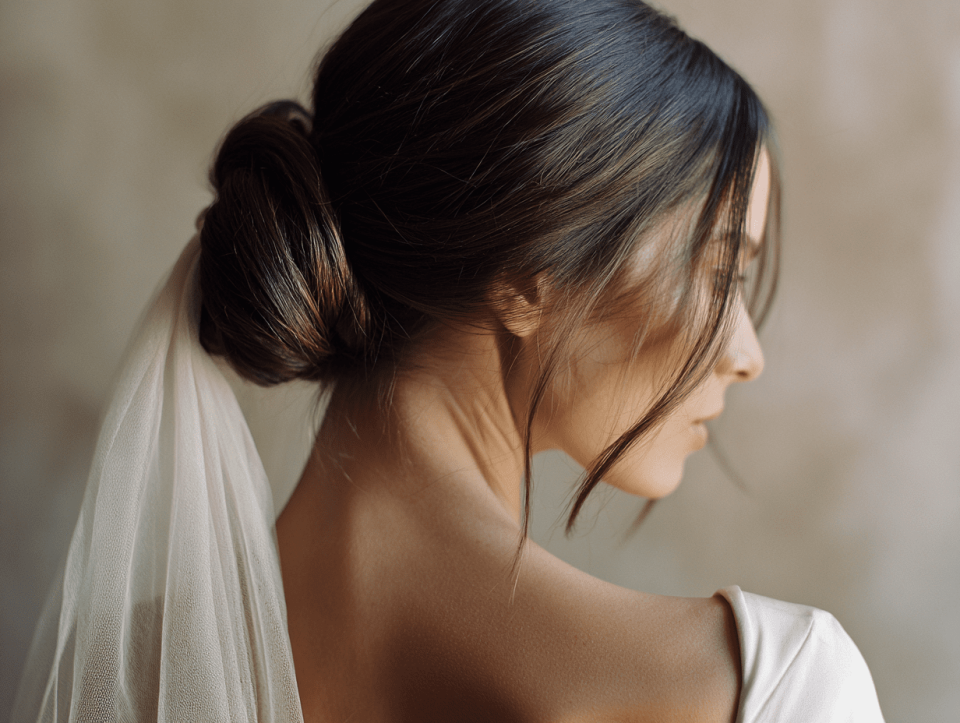 The veil comb slides directly into the bun or twist, anchored with extra bobby pins crossing over the comb teeth. This is the most secure attachment method. Your stylist should build the updo with the comb insertion point in mind, leaving a firm anchor spot that does not disrupt the visual shape of the updo.