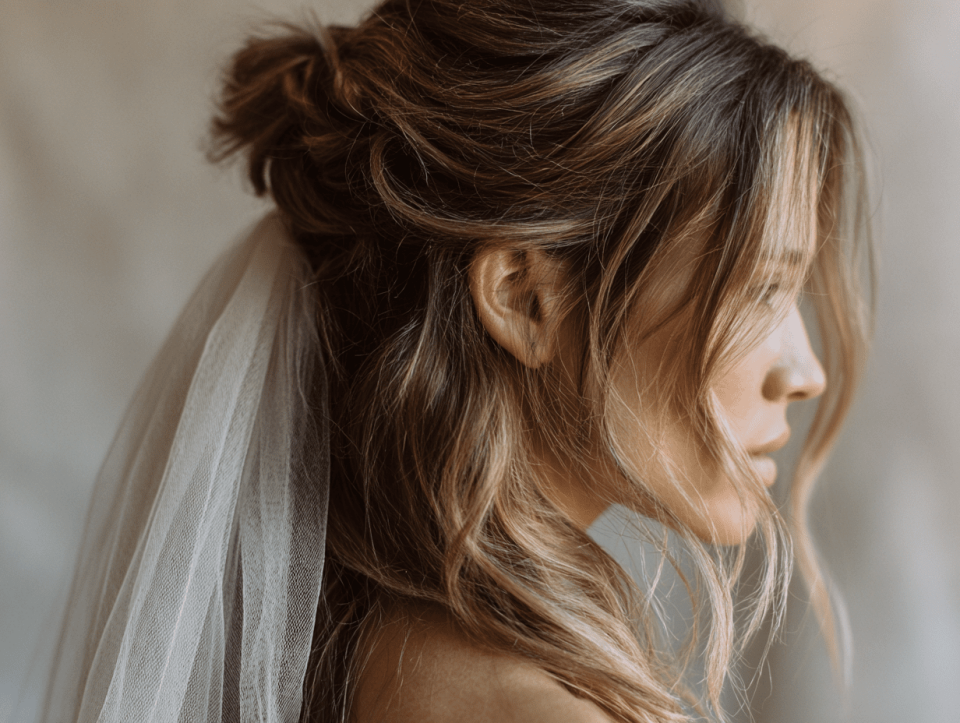 A blusher is a short, single-layer veil that covers the face during the walk down the aisle and is flipped back for the ceremony. It sits at the very top of the head and works best with hairstyles that have volume at the crown: a textured updo, a voluminous half-up style, or a high bun. The blusher needs something to sit on, so flat, sleek styles do not work as well.