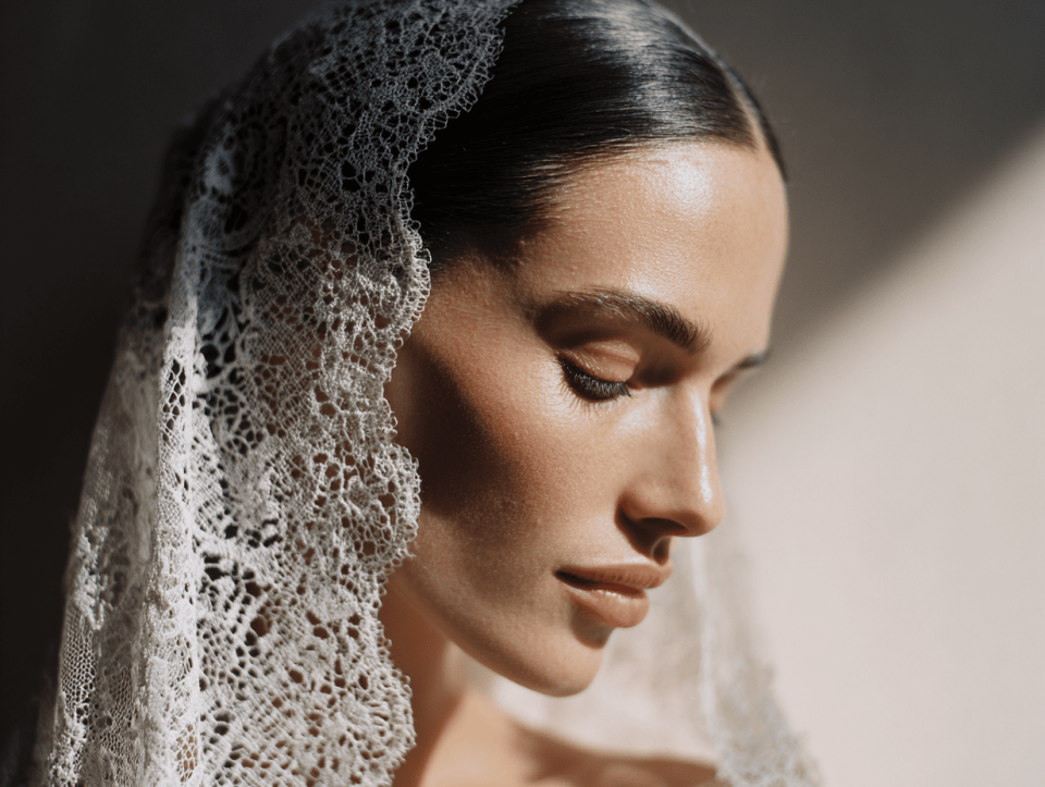 A mantilla drapes directly over the head without a comb, held in place by pins or its own weight. It works best with a center part and smooth, simple hair: a low bun, a center-parted blowout, or sleek half-up waves. The lace edge of the mantilla frames the face, so the hairstyle should be understated to let the veil be the star.