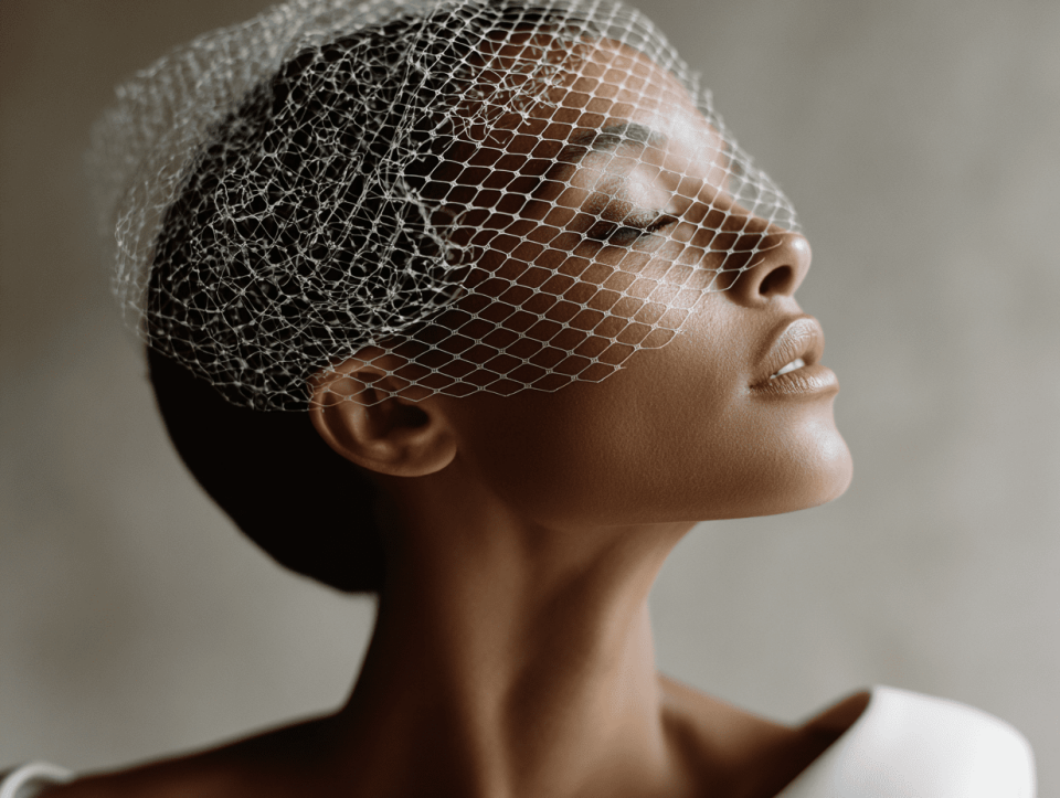 A short, vintage-inspired net that covers just the eyes or extends to the chin. Birdcage veils pair best with sleek, polished, retro hairstyles: a structured chignon, vintage finger waves, a sleek bob, or a polished half-up with smooth waves. The birdcage sits close to the face, so the hairstyle should be swept back from the forehead to avoid visual clutter.
