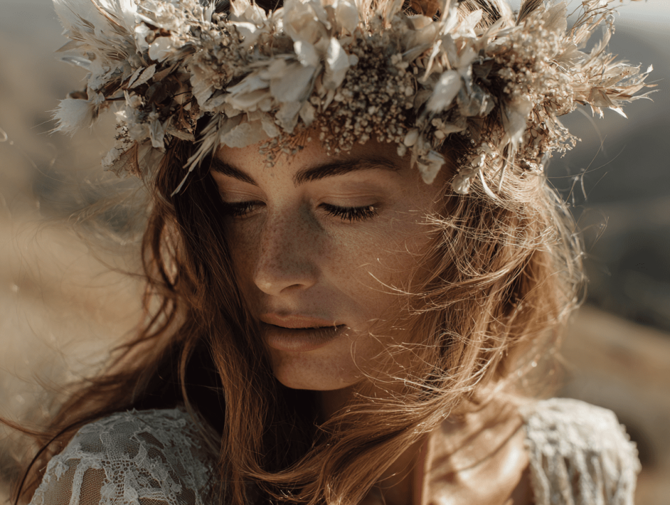 A wreath of preserved, dried flowers and grasses worn on top of the head. Dried flower crowns have a soft, muted, vintage quality that fresh flowers cannot replicate. Popular materials: dried baby's breath, lavender, strawflowers, bunny tails, and preserved roses. They weigh almost nothing, never wilt, and serve as a beautiful keepsake after the wedding. Perfect for boho, rustic, and outdoor weddings. Pair with hair worn down, a half-up style, or a loose braid.
