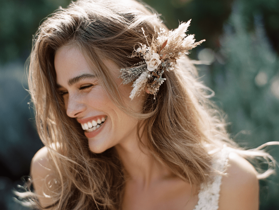 Combine both: A dried flower crown with a few fresh blooms tucked in for fragrance and freshness. Or a silk flower comb with one or two real roses added by your stylist on the morning of. The permanent piece provides the structure and the fresh flowers add the finishing touch.