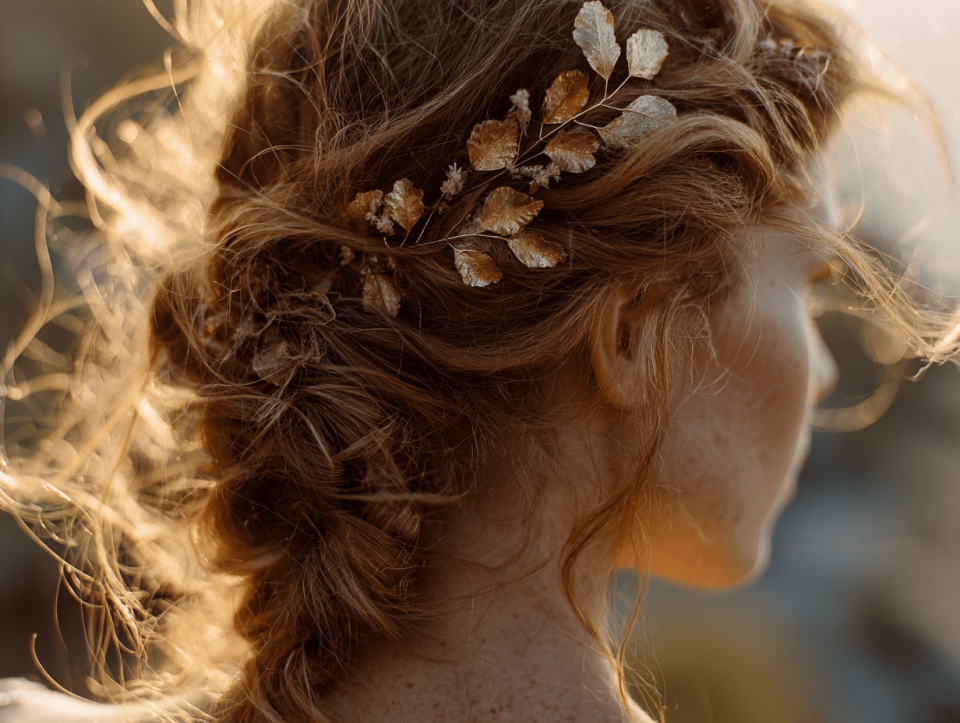 A flexible wire vine with real pressed or resin-encased flowers attached along its length. Pressed flower vines have an ethereal, translucent quality that is completely unique. Each piece is handmade and one-of-a-kind. They wrap around buns, weave through braids, or trace the hairline from ear to ear. More delicate than silk or dried options, so handle with care. Available from artisan jewelers on Etsy and specialty bridal accessory designers.