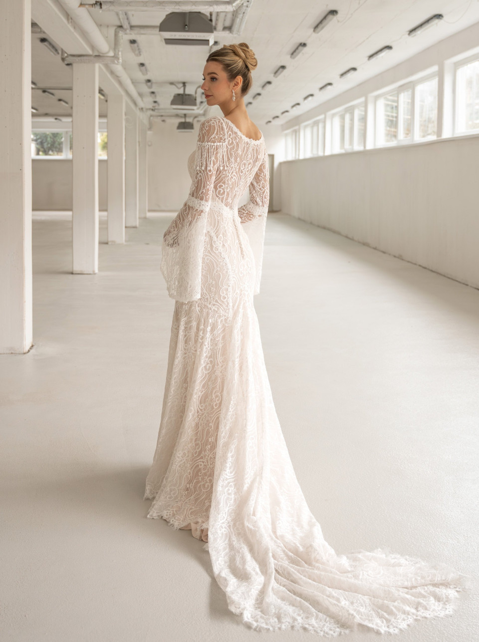 A sleeve that flares out from the elbow or wrist like a bell. Bell sleeves add a bohemian, free-spirited quality and create beautiful movement when you walk and gesture. They range from subtle flare to dramatic, floor-length cascades. Bell sleeves pair well with boho and garden wedding aesthetics. They are statement-making without being heavy.