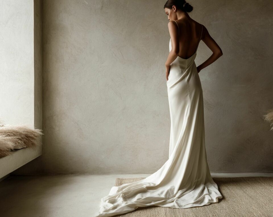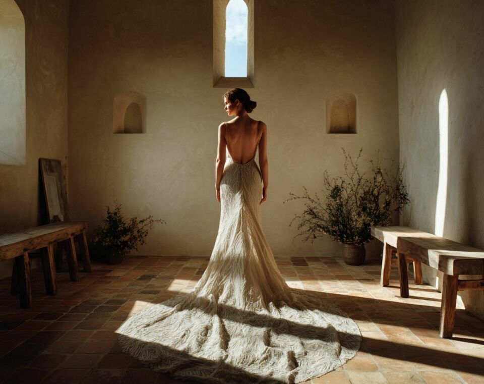 Small or intimate venue: Sweep or court train. A long train in a small space looks disproportionate and gets stepped on by nearby guests.