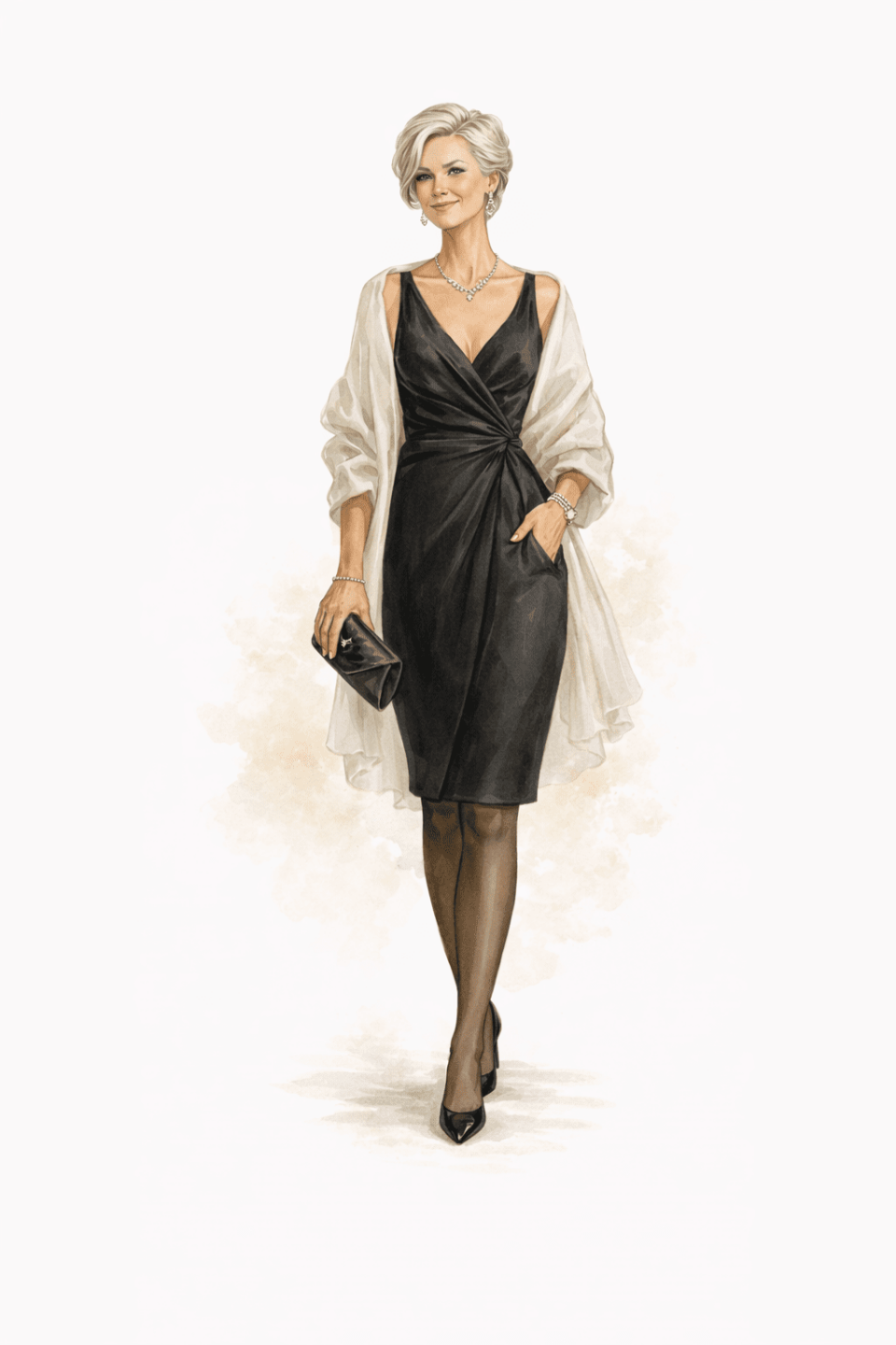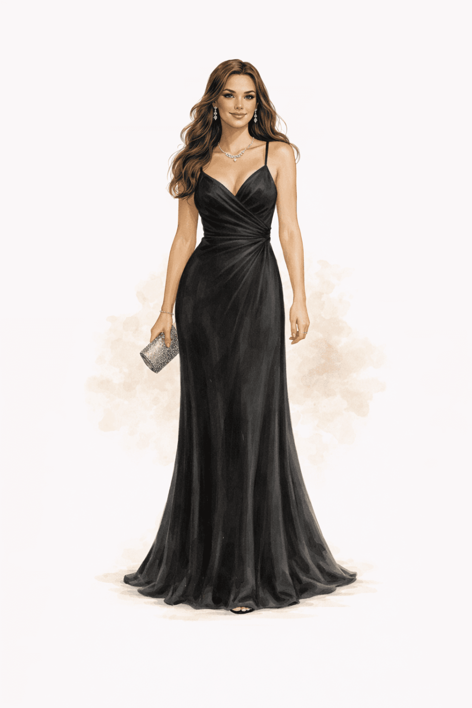 Women: Floor-length gown or a very formal cocktail dress in luxurious fabric. Statement jewelry. Elegant heels. Formal clutch.