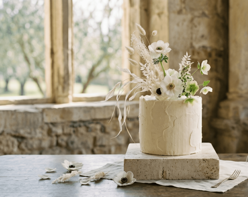 A simple frosted cake with fresh flowers cascading down one side or forming a crown at the top. Small blooms (spray roses, ranunculus, or sprigs of fresh greenery like eucalyptus) work best. Your florist can coordinate with your baker to match your bridal bouquet and color palette. See our wedding cake with flowers guide for pairing ideas.