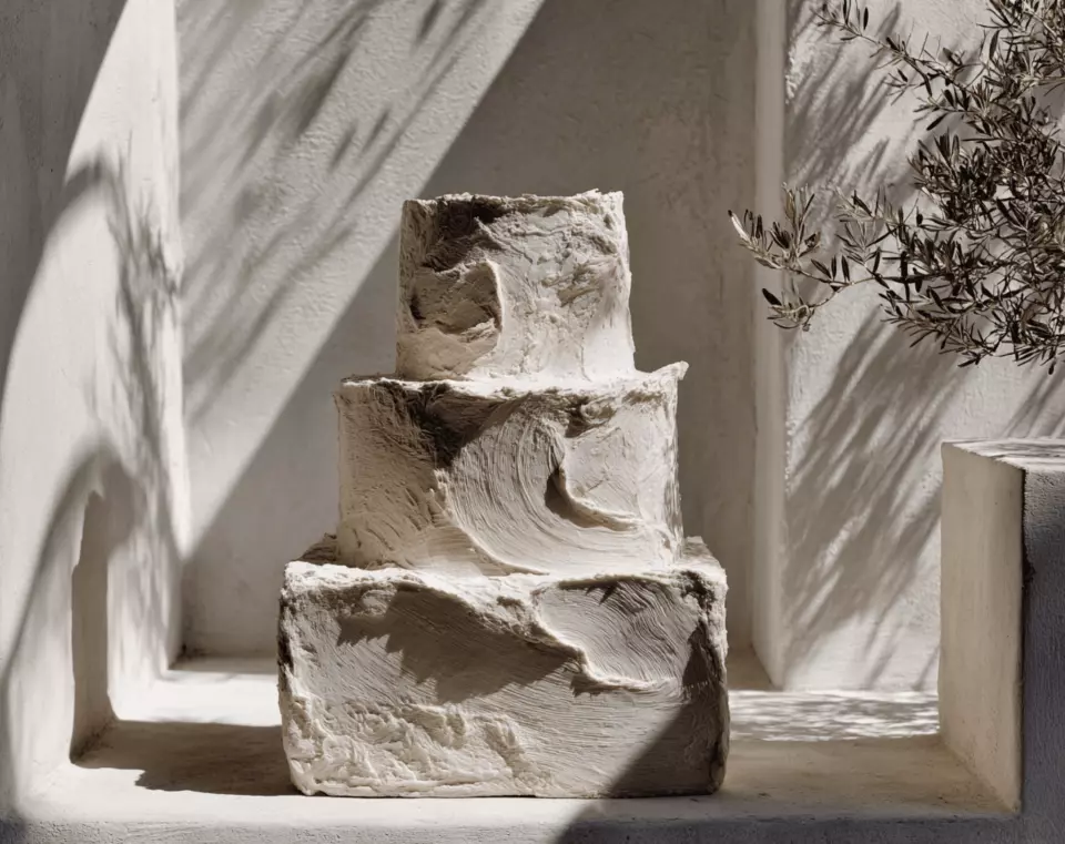 Three tiers of heavily textured buttercream (Swiss meringue swirls, petal piping, sculptural texture). The textural interest replaces traditional decoration. Clean, modern, and visually rich.