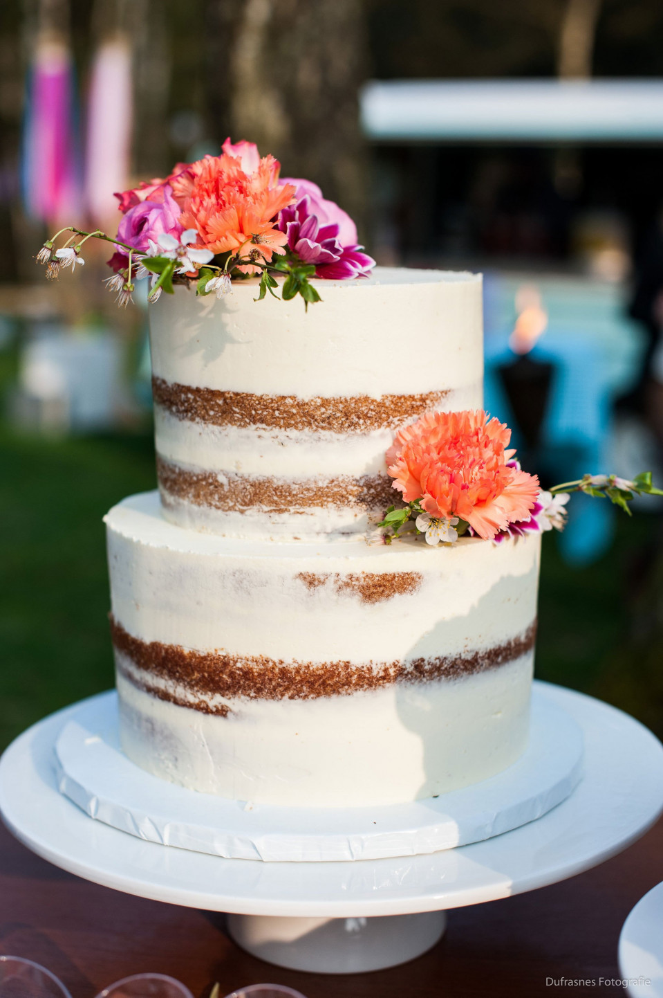 Three tiers with a thin veil of frosting, fresh berries tucked between layers, and cascading greenery. Perfect for garden, farm, and rustic weddings. See our naked cake guide.