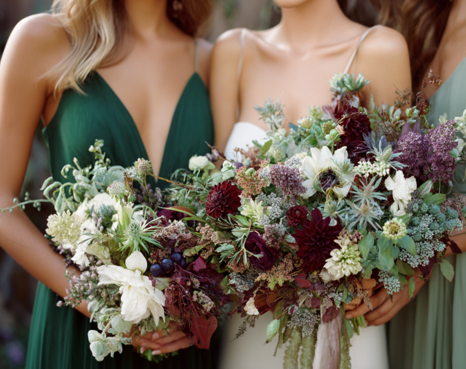 Emerald, sapphire, burgundy, and amethyst layered together for rich, dramatic warmth. This palette suits formal fall weddings and evening celebrations. The deep colors absorb candlelight beautifully. See our moody romantic palette for full coordination.
