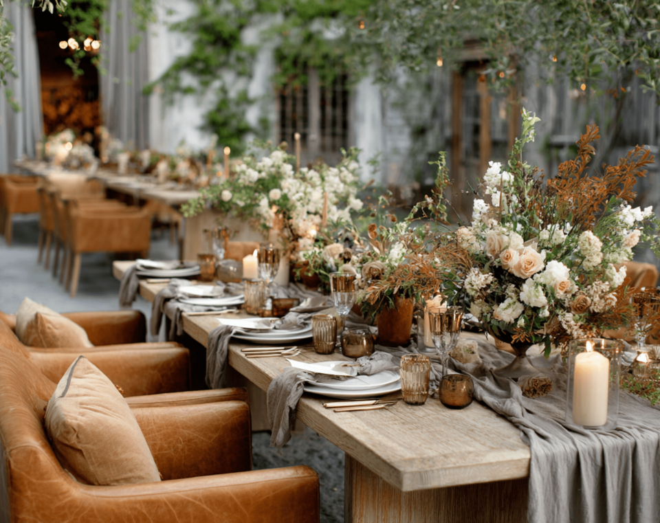 Eucalyptus garlands, autumn-toned branches, and seasonal foliage replace spring and summer florals. Garlands of seeded eucalyptus running down table centers are one of the most popular fall decor elements. Add autumn leaves (real or preserved), berry branches, and dried grasses. See our seasonal flower guide for availability.