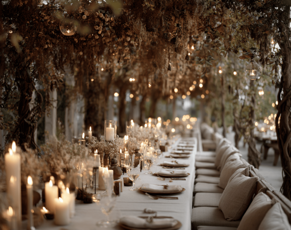 Expert Tip: "The most beautiful fall weddings I have seen use nature as the primary decorator. Autumn does the heavy lifting: the warm light, the colored leaves, the crisp air. Your decor job is to amplify what nature already provides. Candles amplify warm light. Greenery and branches bring nature indoors. Velvet textures echo the richness of the season. You do not need to compete with autumn. You need to collaborate with it."