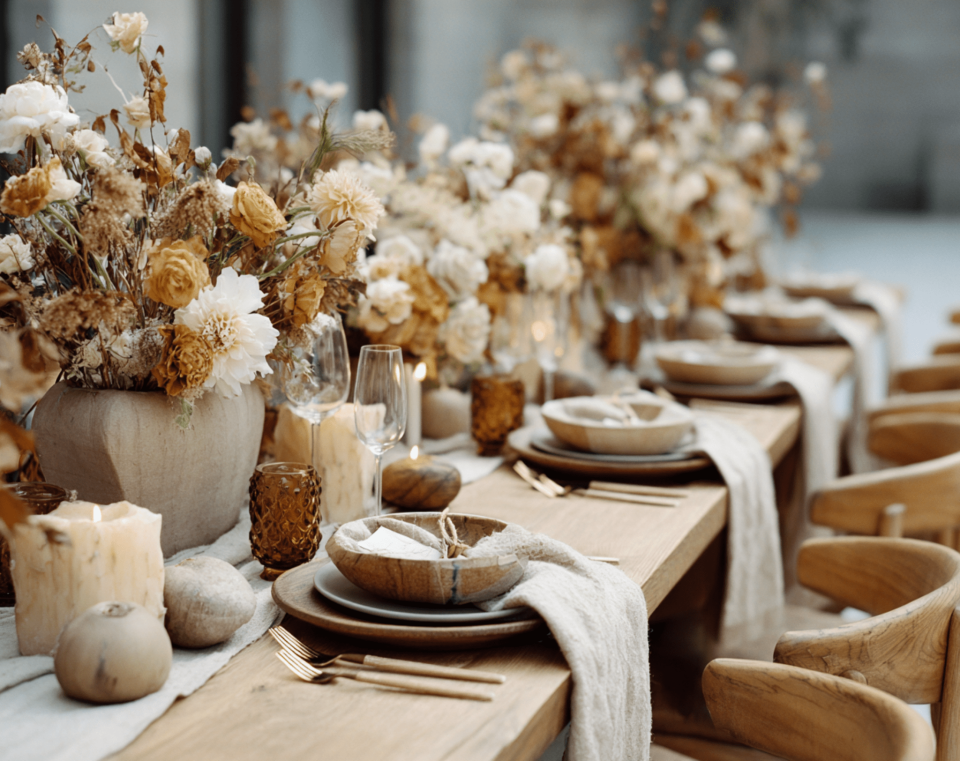 Low, lush arrangements: Seasonal flowers (dahlias, chrysanthemums, garden roses) in low vessels surrounded by candles. Allows conversation across the table.