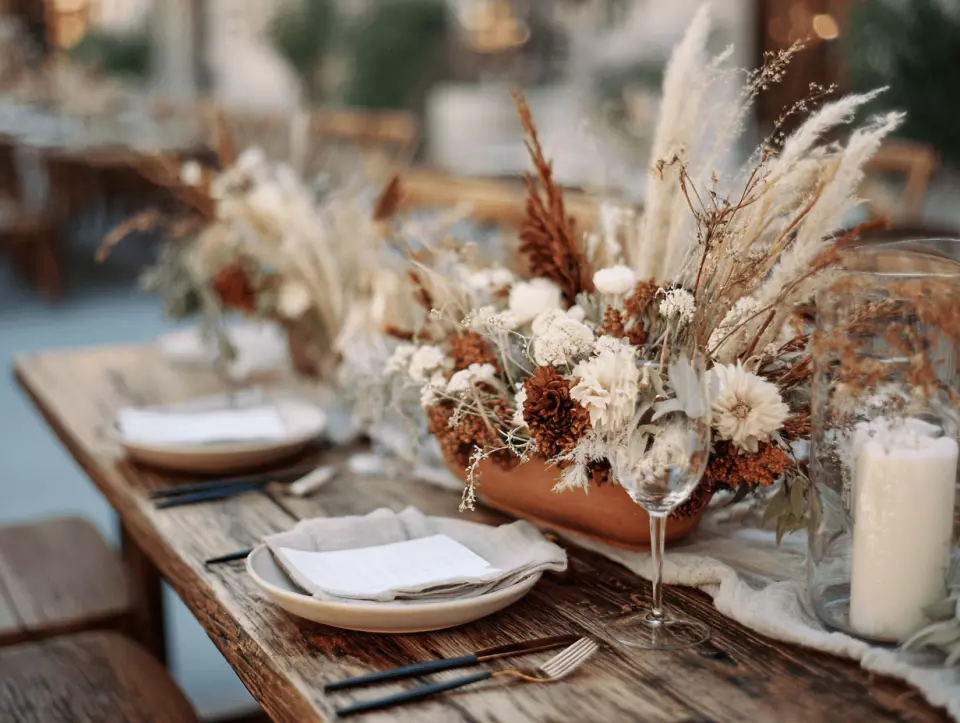 Pampas grass, dried hydrangea, dried roses, wheat stalks, and bunny tail grass add texture and movement. Dried elements are sustainable, affordable, and last through the entire event without wilting. A tall arrangement of pampas grass at the ceremony backdrop is one of the most dramatic fall elements.