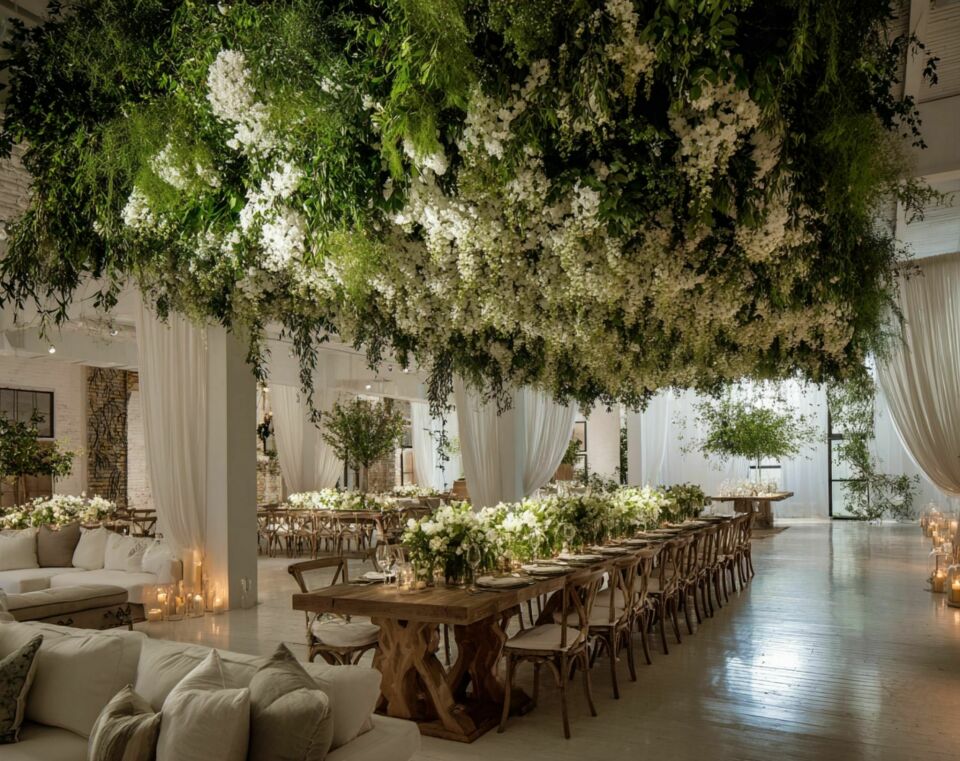 Flowers and greenery suspended from the ceiling above tables, dance floors, or ceremony spaces. The most dramatic floral investment: guests look up and see a garden floating above them. Requires structural ceiling attachments (confirm with venue). Budget $2,000 to $10,000+ depending on size and flower density.