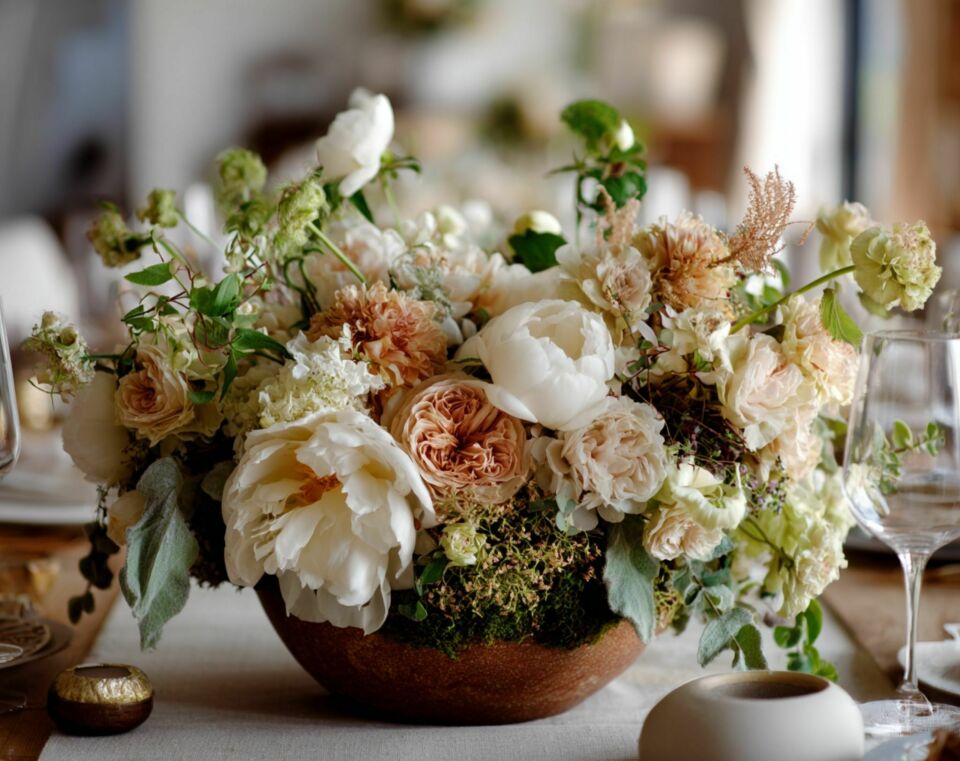 Three flower varieties used abundantly create more visual impact than ten varieties used sparingly. Choose one large feature flower (peonies, dahlias, hydrangea), one medium filler (roses, ranunculus, lisianthus), and one greenery (eucalyptus, ruscus, ferns). Consistency creates cohesion.