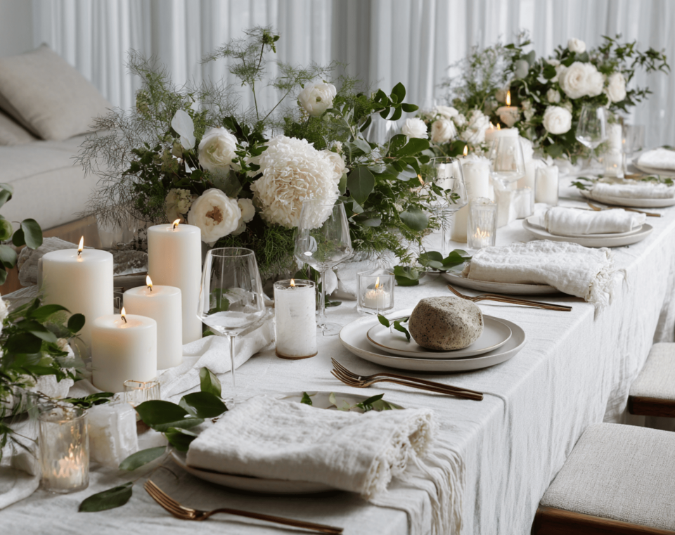 Greenery and flowers running the full length of rectangular tables. The most popular modern centerpiece approach. Eucalyptus garlands with flowers tucked in at intervals and candles nestled throughout. Creates a cohesive, abundant look. Budget $100 to $250 per table depending on flower density.