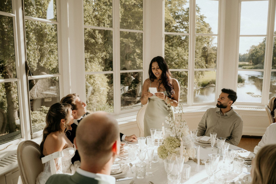 The maid of honor speaks about the bride: their friendship, what the bride means to her, and a warm welcome to the partner. Length: 3 to 5 minutes. Often the most emotional speech of the evening.