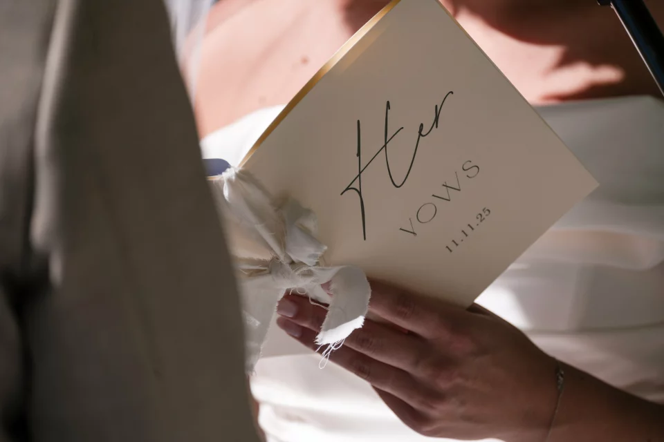 Read your vows out loud at least 5 times. Standing up. At full voice. Time yourself. You will discover which words feel awkward, where the natural pauses fall, and which parts make you cry (plan for those). Practice does not make the emotion disappear. It makes you capable of speaking through it.