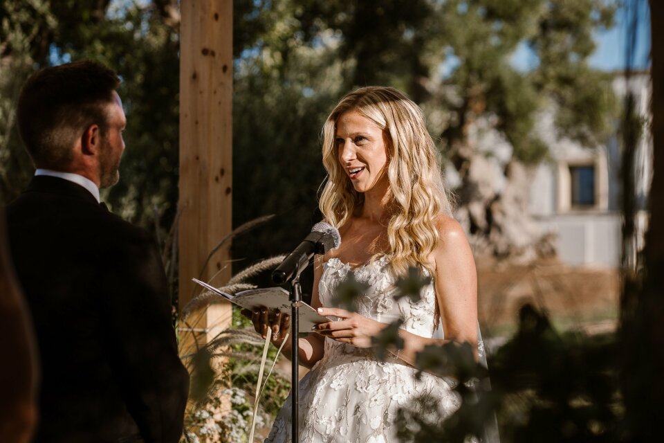 Your vows are spoken in front of an audience. If a reference only makes sense to the two of you, save it for the private letter and choose something the room can follow. One small inside reference is fine if you provide enough context. Five inside jokes in a row alienates your guests.