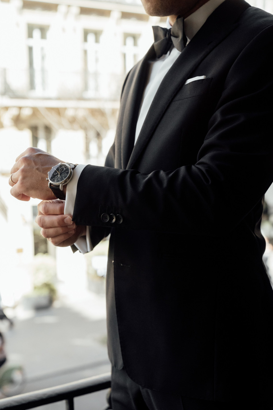 A tuxedo is required for black-tie and white-tie weddings. If your venue is a ballroom, a historic hotel, or a formal evening setting (ceremony after 5 PM), a tuxedo is the traditional choice. The defining features: satin lapels, satin-covered buttons, satin stripe on the trouser seam, and a bow tie.