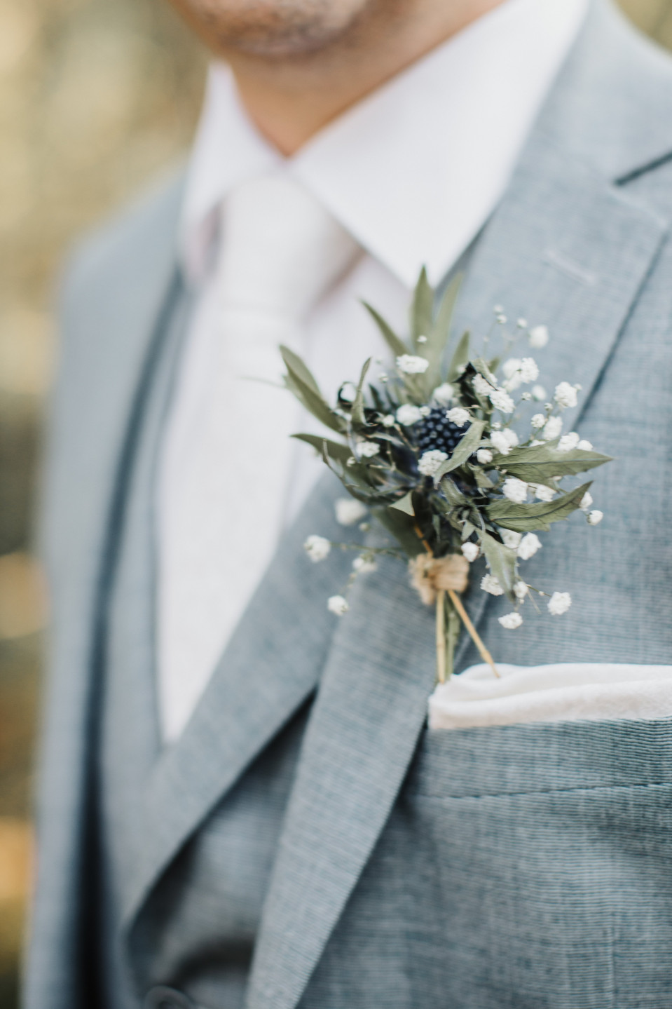 The most popular approach: the groom wears the same suit as the groomsmen but differentiates with accessories. A different tie color, a different pocket square, a boutonniere with a unique flower, or a vest when groomsmen skip theirs. Subtle but visible differentiation.