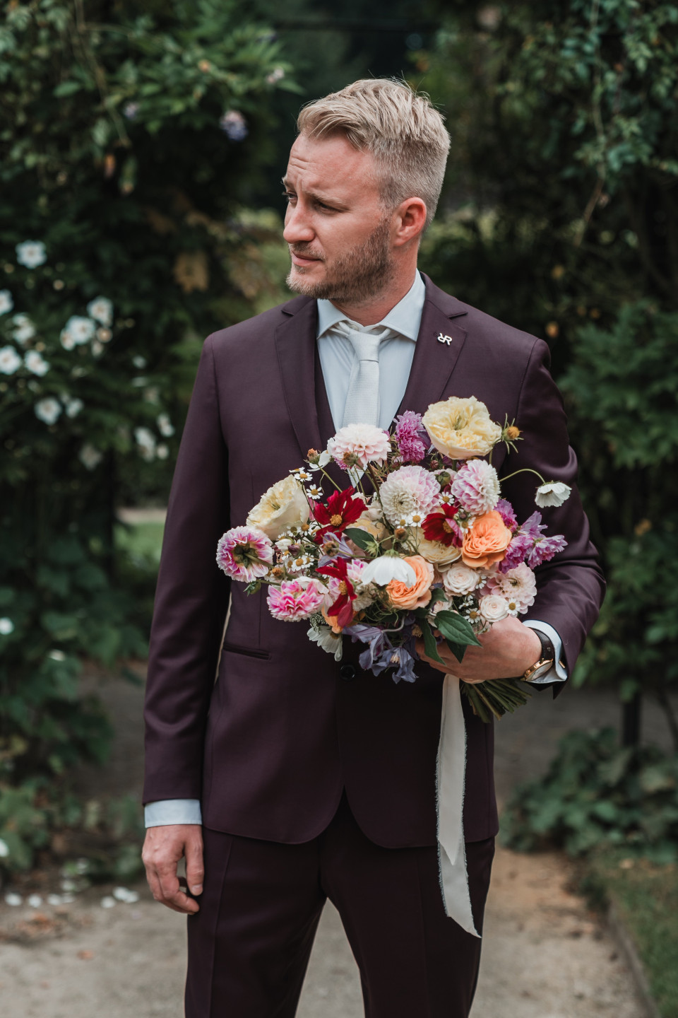 Burgundy, forest green, deep blue, and plum are increasingly popular for fashion-forward grooms. Bold suits make a statement and photograph dramatically. Best for grooms who want to stand out. Pair with neutral accessories to let the suit color be the star.