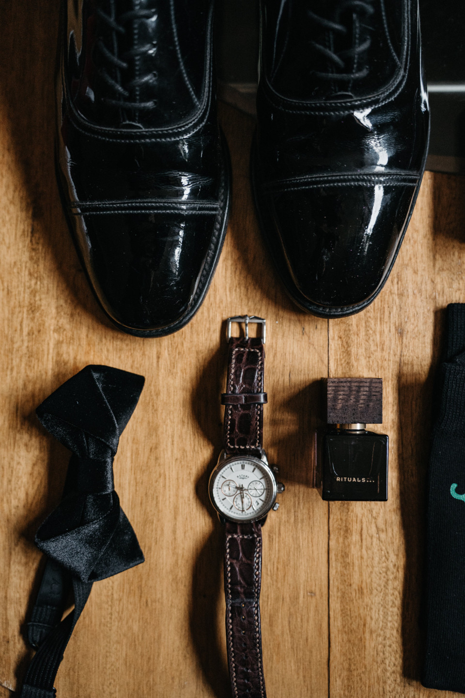 Custom socks: $15 to $30 for quality dress socks with a fun pattern, the wedding date, or "best man" text. Worn during the wedding and photographed during the "groomsmen feet" shot.