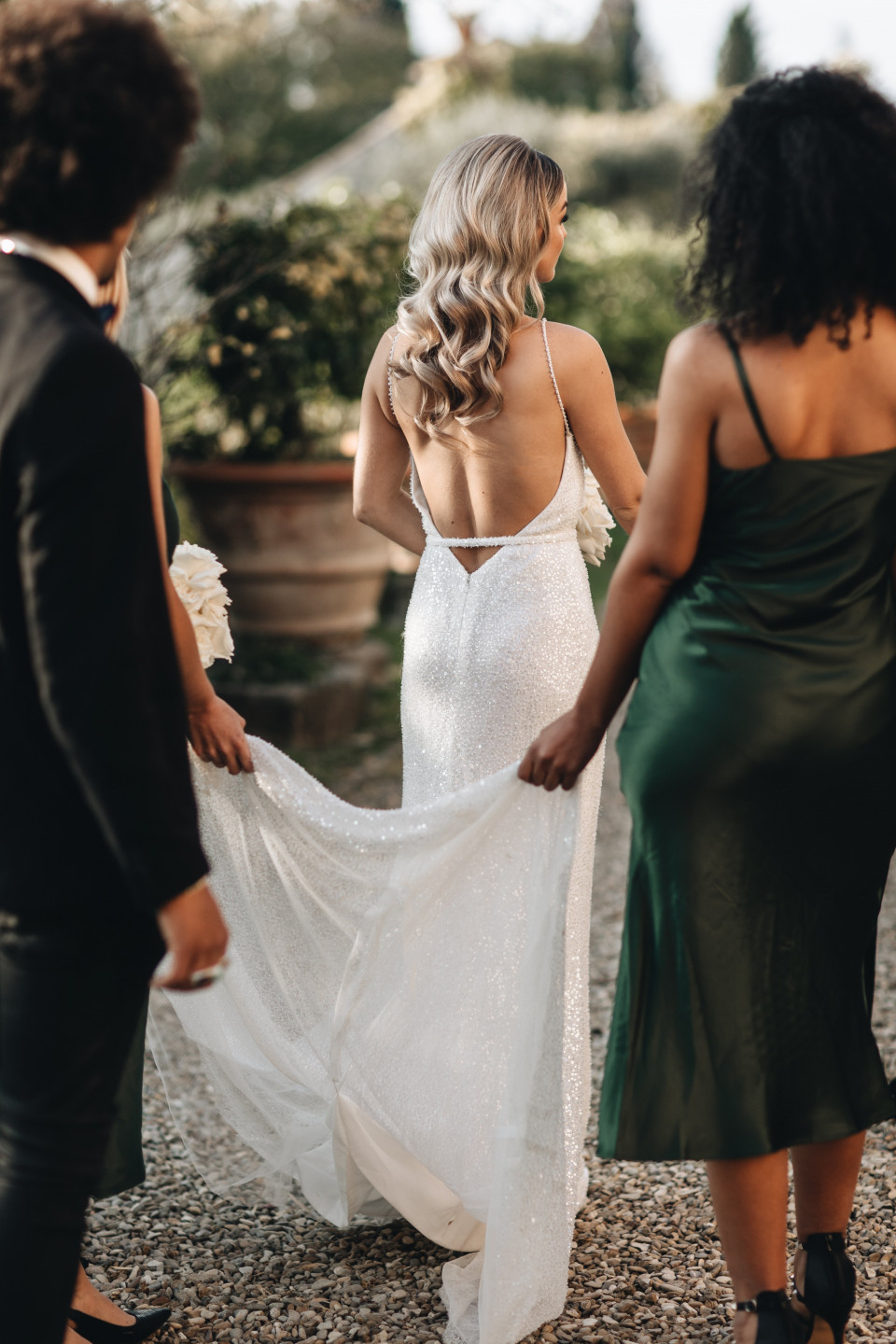 After the ceremony, you bustle the bride's dress for the reception (hooking or tying the train up so she can walk and dance). Learn the bustle at the final dress fitting. Practice multiple times. On the wedding day, this takes 2 to 5 minutes in a private room. It is your most important logistical duty.